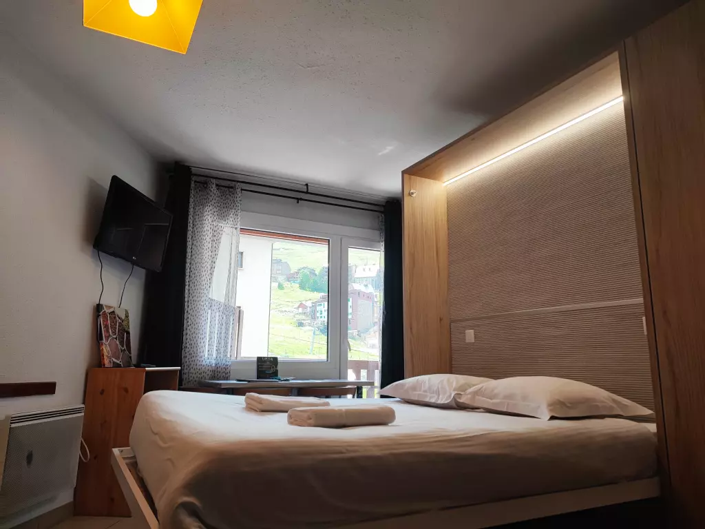 This studio with a balcony with a view of the slopes and the mountains can accommodate up to 4 people. It has a ski locker and is located in a quiet area of ​​the village with direct access to the slopes. HUT2-005806